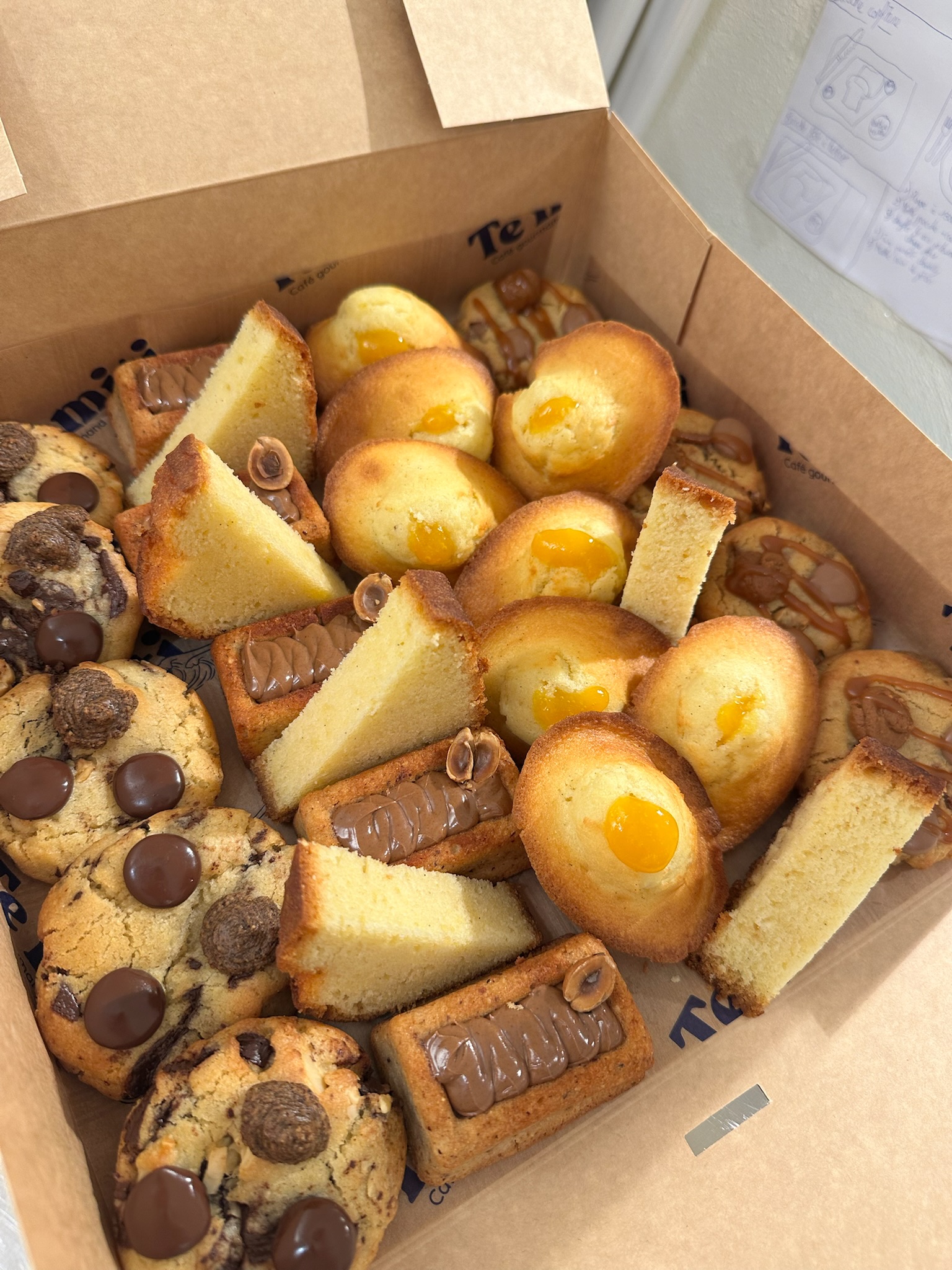 Selection de mini cookie, cake, madeleines et autres pâtisseries du moment. Il y a 30 pâtisseries dans la boîte. Il faut compter 2-3 pâtisseries par personnes.